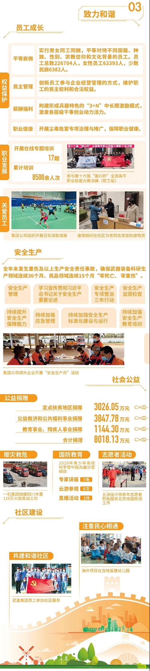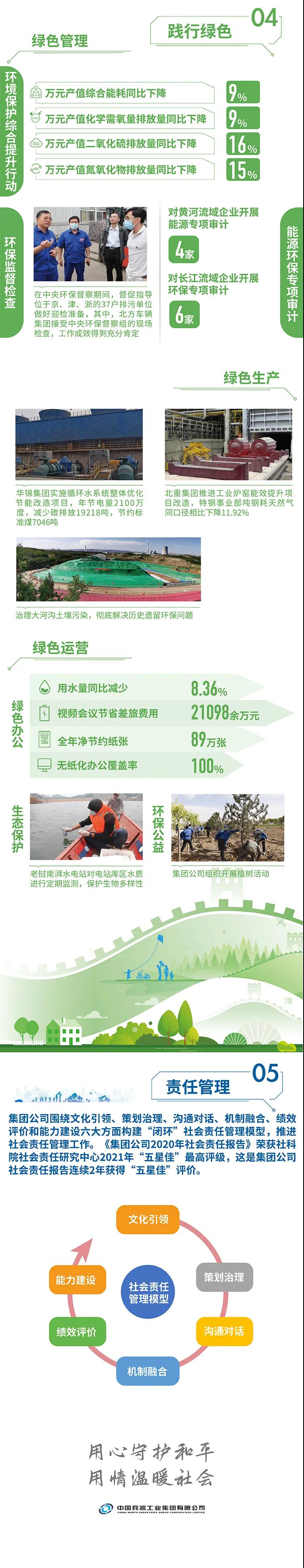 2020年,是“十三五”規(guī)劃收官之年,也是全面建成小康社會、實現第一個百年目標的決勝之年。集團公司黨組書記、董事長焦開河在報告開篇指出,集團公司實現了“十三五”圓滿收官,整體步入了高質量發(fā)展軌道,呈現出基礎更牢、動力更強、空間更大、效能更高的積極向上良好態(tài)勢。在“十三五”特別是近三年來的工作實踐中,我們明確了“集團公司是國家安全和國防建設的脊梁、是國家戰(zhàn)略科技力量最為重要的組成部分、是黨和國家最可信賴的‘六個力量’,肩負著支撐國防軍隊建設、推動科技自立自強、服務構建新發(fā)展格局的重大政治責任和光榮使命,具有極強的政治屬性,性質特殊、使命特殊、責任特殊”的新時代新階段職責使命,深化了對“堅持以習近平新時代中國特色社會主義思想定向領航,是集團公司高質量發(fā)展的根本遵循;保持貫徹落實習近平總書記重要指示批示和黨中央決策部署的戰(zhàn)略定力,是集團公司高質量發(fā)展的根本前提;履行好強軍這個首要職責,是集團公司高質量發(fā)展的根本要求;加快兵器科技創(chuàng)新突破,是集團公司高質量發(fā)展的根本支撐;加強黨的領導黨的建設,是集團公司高質量發(fā)展的根本保證”的兵器工業(yè)改革發(fā)展規(guī)律認識。 《報告》聚焦“抗疫斗爭中的‘兵器力量’”,生動展示了集團公司抗擊疫情的有力行動,展現了集中力量辦大事、急國家之所急的“兵器速度”,彰顯了“把一切獻給黨”的人民兵工精神和貫徹落實國家決策部署的責任擔當。《報告》以“用心守候和平、用情溫暖社會”為主題,從恪守本責、共創(chuàng)價值、致力和諧、踐行綠色、責任管理五個維度,全面展現集團公司在堅持履行政治責任、經濟責任、社會責任,履行強軍首責、加強黨的建設、打造國家戰(zhàn)略科技力量、推進“一帶一路”倡議、打好打贏三大攻堅戰(zhàn)、深化改革、助力員工成長、支持社會公益事業(yè)、提升社會責任管理等方面的生動實踐和履責亮點,凸顯集團公司保持貫徹落實黨中央決策部署的戰(zhàn)略定力、在聚焦主責主業(yè)、科技引領、國際化經營上持續(xù)用力,為實現第一個百年奮斗目標貢獻力量的初心與行動?!秷蟾妗吩俅潍@得中國企業(yè)社會責任報告評級專家委員會“五星佳”最高評級,兵器工業(yè)集團成為軍工行業(yè)唯一連續(xù)10年獲得最高評級的企業(yè)。 2021年是開啟新征程的開局之年,也是建黨100周年、人民兵工創(chuàng)建90周年,兵器工業(yè)集團將全面貫徹落實黨中央戰(zhàn)略部署,緊扣推動高質量發(fā)展主題,圍繞“十四五”開好局、起好步,堅決完成黨中央賦予的職責使命,履行好中央企業(yè)和軍工集團的政治責任、經濟責任、社會責任,為實現中國夢強軍夢作出新的更大貢獻! 一圖看懂《中國兵器工業(yè)集團有限公司2020年社會責任報告》