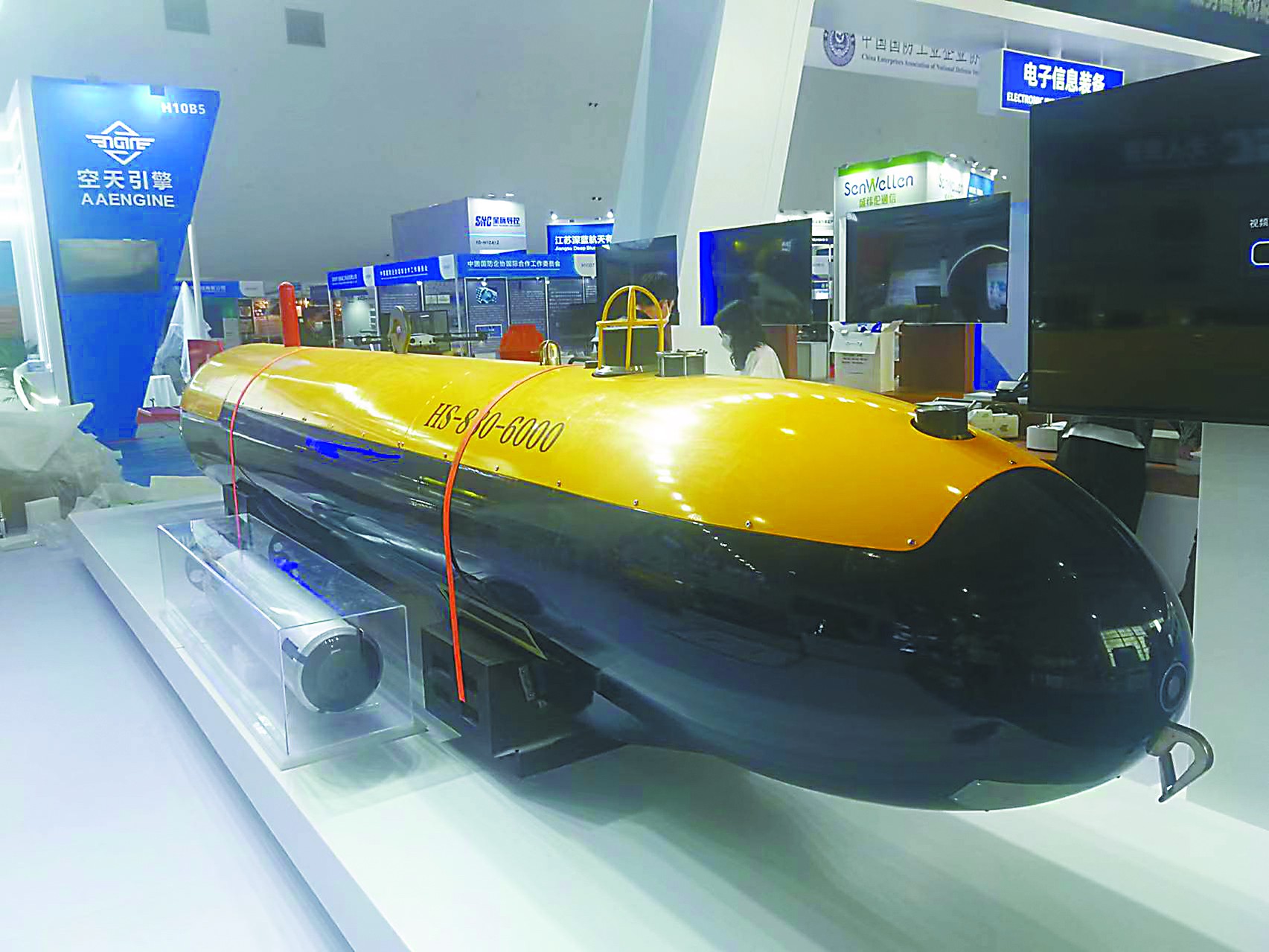 相比公眾相對熟悉的無人機(jī)和無人車,無人船和無人潛航器的知名度略低,但本屆珠海航展上展出的相關(guān)裝備具備相當(dāng)高的水平。例如HS-880-6000型自主式水下航行器(AUV)就是國內(nèi)首型搜救型無人潛航器。它的最大工作深度達(dá)6000米,能以3節(jié)的速度連續(xù)航行24小時,配備有深水遇險目標(biāo)高分辨低照度照明系統(tǒng)、聲信標(biāo)定向引導(dǎo)聲吶、水聲探測側(cè)掃聲吶等,具備工作水深范圍寬、載荷能力大、續(xù)航力長、搜尋探測能力強(qiáng)等特點,可對深海目標(biāo)全自主精細(xì)搜尋、探測、定位,執(zhí)行深海水下目標(biāo)搜尋探測和海洋科學(xué)研究任務(wù)。另一款“守望者”無人潛航器個頭小巧,配備有光學(xué)探頭、戰(zhàn)斗部和通信設(shè)備,可以自動靠近水中或海底目標(biāo)進(jìn)行觀測、毀傷目標(biāo),用于執(zhí)行反水雷、排障、海底管道巡檢等任務(wù)。