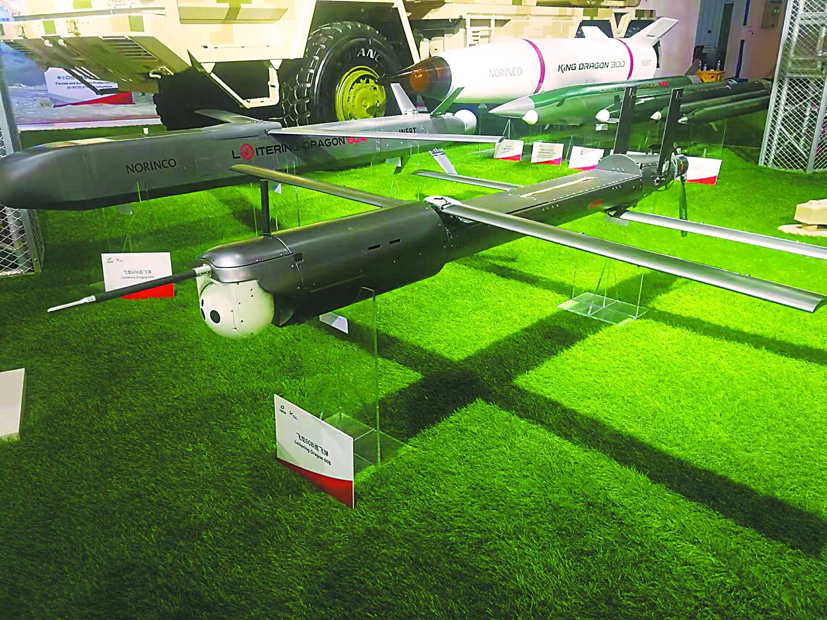 兵器工業(yè)集團(tuán)展出的SR-5遠(yuǎn)程火箭炮系統(tǒng)被稱為“中國版‘海馬斯’”,它的特點之一就是能共架發(fā)射“飛龍-60”巡飛彈,從而引導(dǎo)火箭炮對數(shù)百公里外目標(biāo)的遠(yuǎn)程精確打擊。
