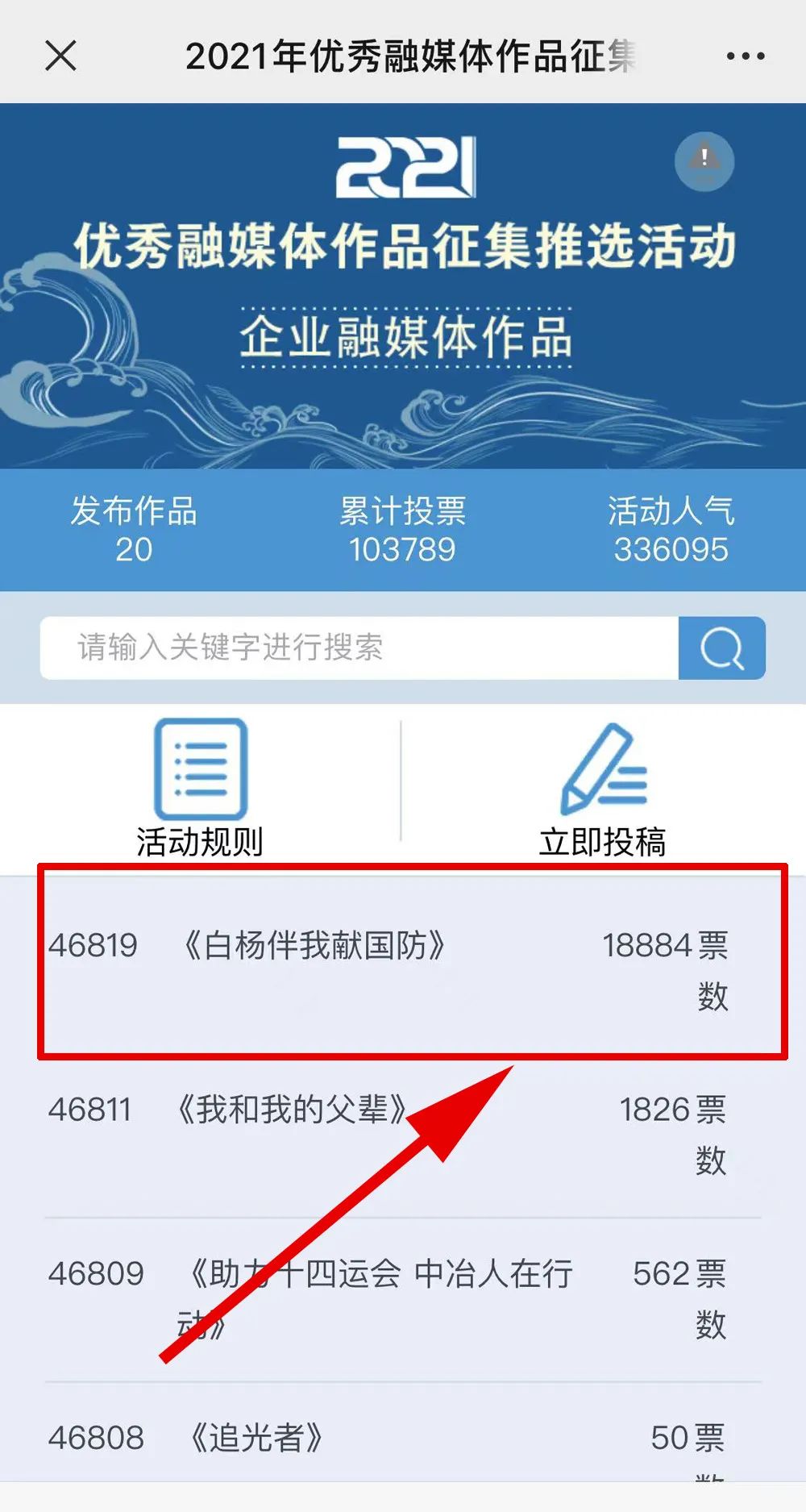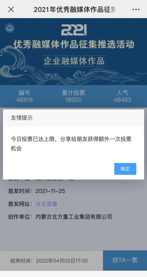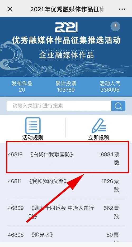 近日,由“文化強(qiáng)國(guó)”光明日?qǐng)?bào)協(xié)同推廣平臺(tái)、光明網(wǎng)、北京師范大學(xué)新媒體傳播研究中心和光明天翼5G融媒實(shí)驗(yàn)室共同主辦的“2021年優(yōu)秀融媒體作品征集推選活動(dòng)”開啟線上投票環(huán)節(jié),經(jīng)過(guò)專家委員會(huì)評(píng)審,中國(guó)兵器工業(yè)集團(tuán)北重集團(tuán)《白楊伴我獻(xiàn)國(guó)防》音樂MV入選活動(dòng)前二十名,并進(jìn)入網(wǎng)絡(luò)投票環(huán)節(jié)。 《白楊伴我獻(xiàn)國(guó)防》 楊樹參天 高聳云端的是兵工人 “履行好強(qiáng)軍首責(zé)”的壯志凌云! 深植北疆 傾獻(xiàn)沃土的是北重人 “推動(dòng)高質(zhì)量發(fā)展”的壯志豪情! 白楊樹伴著我們茁壯成長(zhǎng) 見證著我們獻(xiàn)身國(guó)防! 投票方式 1.掃描下方二維碼,進(jìn)入初始界面,點(diǎn)擊“企業(yè)融媒體作品征集”,進(jìn)入投票界面點(diǎn)擊《白楊伴我獻(xiàn)國(guó)防》,點(diǎn)擊“投TA一票”; 2. 每人每日可投10票,直至提示投票達(dá)到上限即可; 3.投票時(shí)間:2022年3月17日09:00-2022年4月2日17:00。 來(lái)源/光明網(wǎng)、北重集團(tuán) |